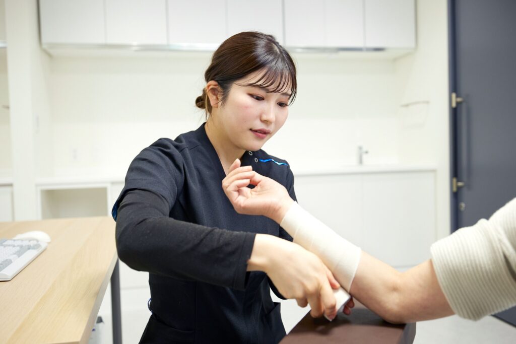 安静指導、固定、薬物療法、注射などの保存療法を行います。怪我の直後には、RICE処置(安静・冷却・圧迫・挙上)の指導も行います。